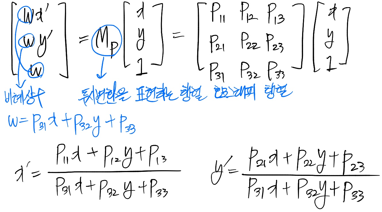 #OpenCV는 투시변환행렬을 구하는 함수, 투시 변환 행렬을 이용하여 실제 영상을 투시변환하는 함수 제공 #투시변환행렬을 구하는 함수 Mat getPerspectiveTransform(src, dst, solveMethod); /* src : 입력 영상 네점의 좌표 dst : 결과 영상 네점의 좌표 solveMethod : 연립방정식을 풀 때 사용할 계산방법지정 */ #투시변환행렬을 가지고 있을 때 영상을 투시변환한 결과 영상을 생성하는 함수 void warpPerspective(src, dst, M, dsize, flags, borderMode, borderValue); /* src : 입력영상 dst : 결과 영상 M : 어파인 변환 행렬 dsize : 결과 영상 크기 flags : 보간법 알고리즘 borderMode : 가장자리 픽셀 확장 방식 borderValue : borderMode==BORDER_CONTANT경우 사용할 상수 값 */더보기3차원->2차원표현은 가능하나 2차원->3차원표현은 불가능 : epipolar line이라고 함