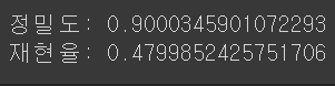 from sklearn.metrics import precision_score, recall_score print('정밀도 :',precision_score(y_train_5, y_train_pred)) print('재현율 :',recall_score(y_train_5, y_train_pred))