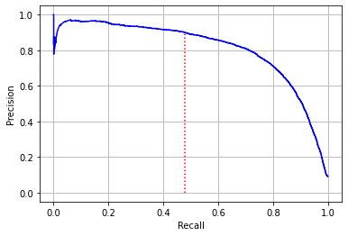 def plot_precision_vs_recall(precisions, recalls): plt.plot(recalls,precisions, 'b-') plt.xlabel('Recall', fontsize=10) plt.ylabel('Precision', fontsize=10) plt.grid(True) plot_precision_vs_recall(precisions, recalls) recall_90_precision = recalls[np.argmax(precisions>=0.9)] plt.plot([recall_90_precision, recall_90_precision],[0,0.9],'r:') plt.show()