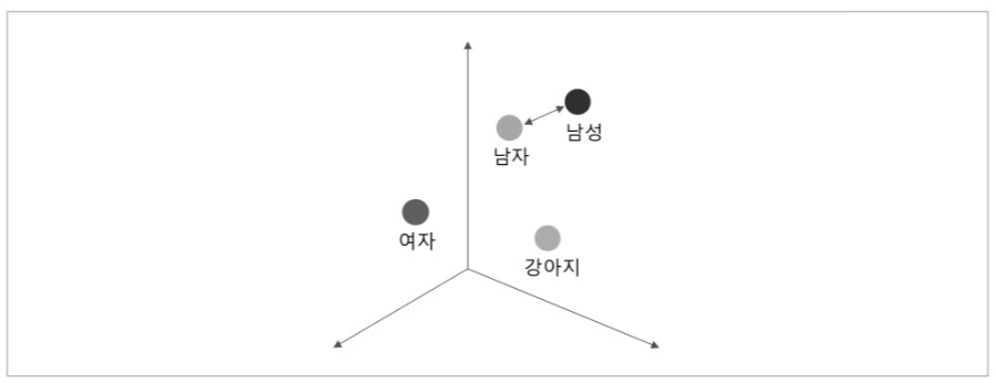 - 벡터 공간 상에서 유사한 의미를 갖는 단어들은 비슷한 위치에 분포되어 있기 때문에 두 단어 간의 거리를 계산할 수 있으면 컴퓨터는 두 단어를 같은 의미로 해석할 수 있음