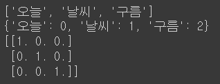 from konlpy.tag import Komoran import numpy as np komoran=Komoran() text='오늘 날씨는 구름이 많아요.' #1. 명사만 추출 nouns=komoran.nouns(text) print(nouns) #2. 단어 사전 구축 및 단어별 인덱스 부여 dics={} for word in nouns: if word not in dics.keys(): dics[word]=len(dics) print(dics) #3.원-핫 인코딩 nb_classes=len(dics) targets=list(dics.values()) one_hot_targets=np.eye(nb_classes)[targets] print(one_hot_targets)