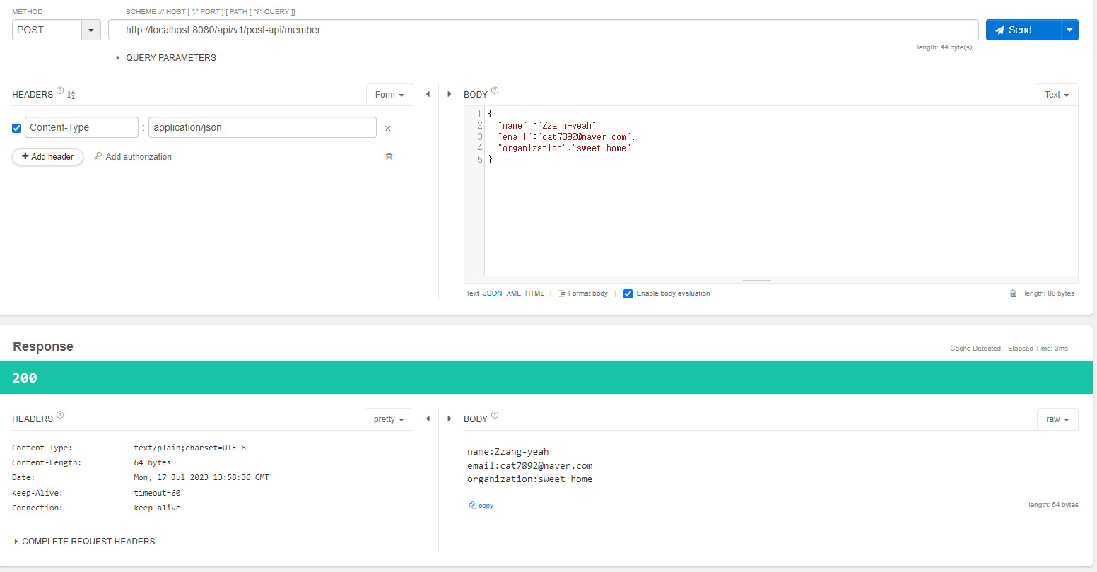 앞에서 살펴본 GET API에서는 URL의 경로나 파라미터에 변수를 넣어 요청을 보냈지만 POST API에서 저장하고자 하는 리소스나 값을 HTTP 바디(body)에 담아 서버에 전달