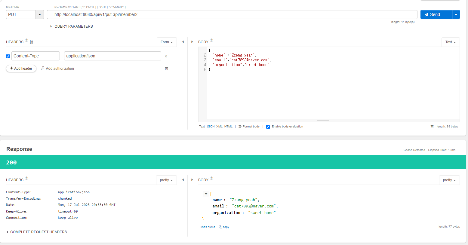 PUT API는 POST메서드와 마찬가지로 값을 HTTP Body에 담아 전달
