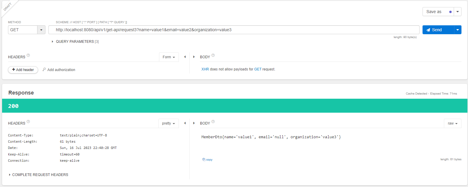 //dto/MemberDto에 작성 package dto; import org.springframework.web.bind.annotation.GetMapping; import org.springframework.web.bind.annotation.RequestMapping; import org.springframework.web.bind.annotation.RestController; public class MemberDto { private String name; private String email; private String organization; public String getName() { return name; } public void setName(String name) { this.name = name; } public String getEmail() { return email; } public void setMail(String email) { this.email = email; } public String getOrganization() { return organization; } public void setOrganization(String organization) { this.organization = organization; } @Override public String toString() { return "MemberDto{" + "name='" + name + '\'' + ", email='" + email + '\'' + ", organization='" + organization + '\'' + '}'; } }//com.springboot.api/controller/GetController 에 작성 package com.springboot.api.controller; import dto.MemberDto; import org.springframework.web.bind.annotation.*; import java.util.Map; @RestController @RequestMapping("/api/v1/get-api") public class GetController { //http://localhost:8080/api/v1/get-api/request3?name=value1&email=value2&organization=value3 //@ApiOperation(value = "GET 메소드 예제", notes = "DTO를 활용한 GET Method")->이거 안돌아감 왜? @GetMapping(value="/request3") public String getRequestParam3(MemberDto memberDto){ //return memberDto.getName()+" "+memberDto.getEmail()+" "+memberDto.getOrganization(); return memberDto.toString(); } }