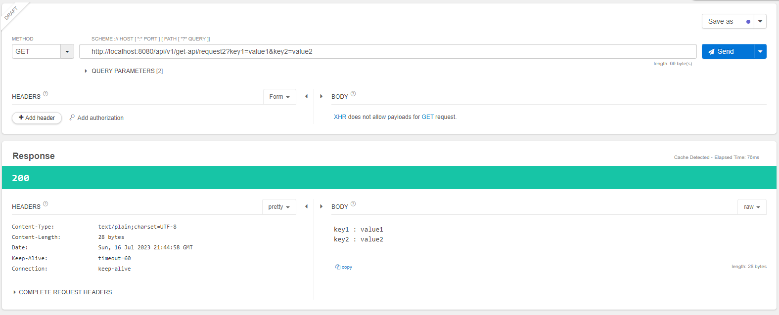 package com.springboot.api.controller; import org.springframework.web.bind.annotation.*; @RestController @RequestMapping("/api/v1/get-api") public class GetController { //http://localhost:8080/api/v1/get-api/request1?name=value1&email=value2&organization=value3 @GetMapping(value="/request1") public String getRequestParam1( @RequestParam String name, @RequestParam String email, @RequestParam String organization){ return name+" "+email+" "+organization; } }