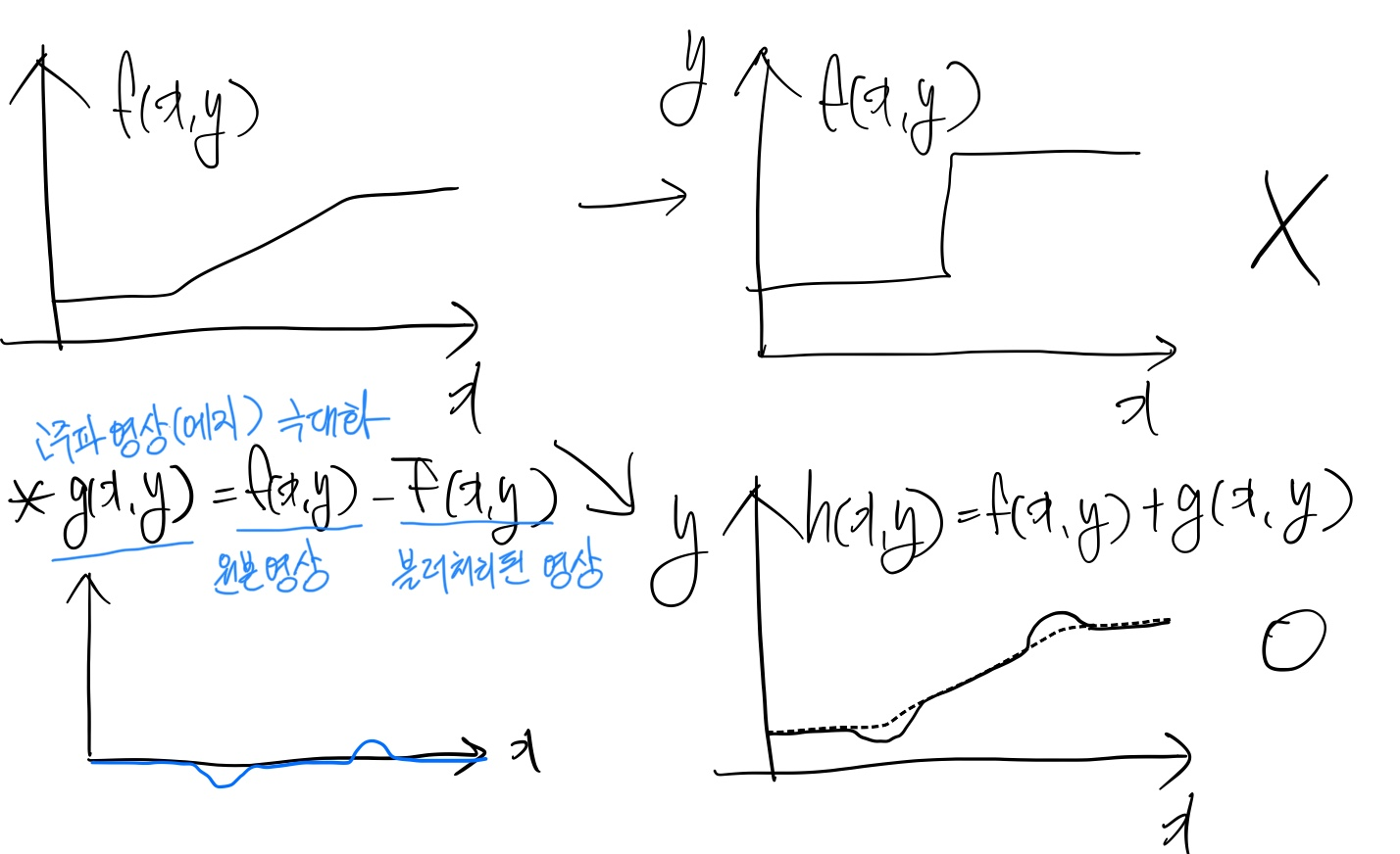영상을 샤프하게 만들려면 위의 그림과 같이 부드러운 기울기(블러)를 빡세게 바꿔줘야하는데 모든 블러를 처리하긴 힘듦 미세한 픽셀만 조정(g(x,y))해서 원본 영상을 왜곡시켜 샤프닝하게 만듦