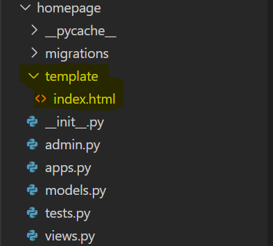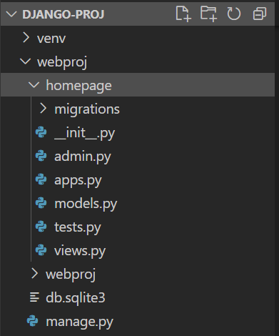 (venv)~~~~$django-admin startapp <app_name>(venv) PS C:~~\django-proj\webproj> django-admin startapp homepage