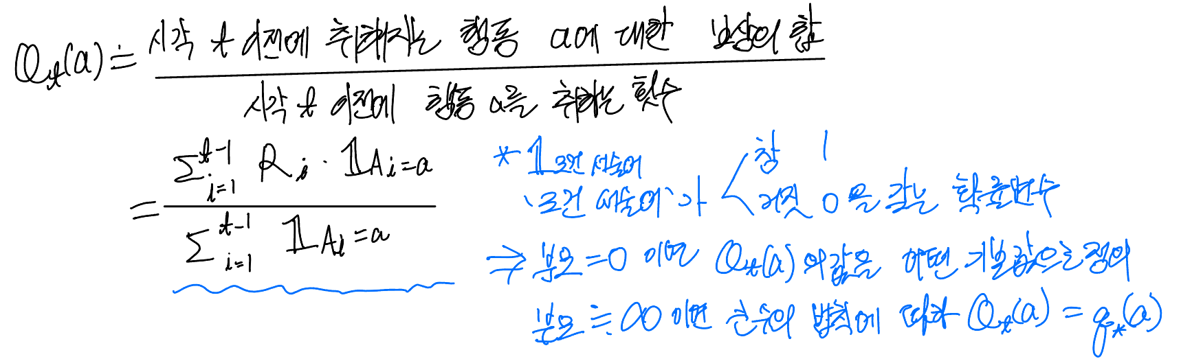 이제 임의의 행동 a의 가치 q*(a)는 행동 a가 선택되었을 때 얻는 보상의 기댓값(아래와 같이 표현)