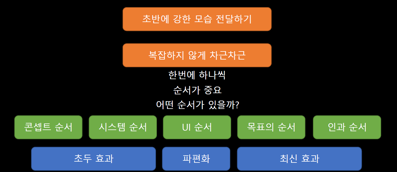 게임의 초기-중기-후기의 핵심 가치를 담을 것