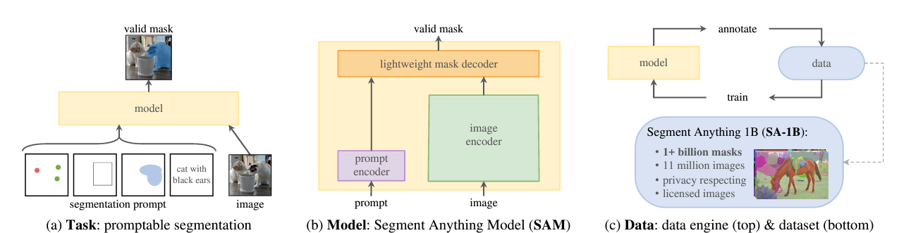 image encoder가 이미지 임베딩을 계산하고 prompt encoder가 프롬프트를 임베딩한 후 두 정보를 lightweight mask decoder에서 결합하면 앞의 3가지 문제가 해결된다는 걸 발견