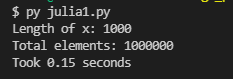 def calculate_z_serial_purepython(maxiter, zs, cs): output=[0]*len(zs) for i in range(len(zs)): n=0 z=zs[i] c=cs[i] while n<maxiter and abs(z)<2: z=z*z+c n+=1 output[i]=n return output저자의 환경에선 크기가 1000*1000이고 maxiter=300인 줄리아 집합을 계산하는 과정이 대략 8초 정도 걸렸다고 함