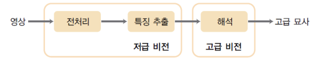 고급 비전(high-level vision)은 앞에서 추출한 특징을 입력 받아 분석하고 해석하여 고급 묘사(high-level description)을 출력하는 단계