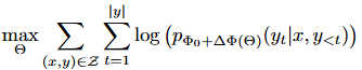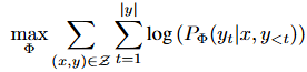 =>x(context)와 t(지금)전까지 생성된 y(target tokens)가 주어졌을 때, yt(지금 target token)이 나타날 확률(P Φ)에 대한 로그값(1. log부분)을 시퀀스 내의 모든 토큰에 대한 예측 확률을 고려(2.시그마 t=1, |y| 부분)하고 Z(훈련 데이터셋)에 있는 모든 x,y(context-target 쌍)에 대해 합산(3. 시그마 (x,y) ∈ Z 부분)하여 Φ(모델 파라미터)를 최적화하여 목적 함수의 값을 최대화(4. max Φ 부분)