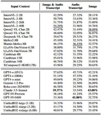 - proprietary 모델들은 대부분 나은 성능을 보이지만 image/audio 하나를 제거하면 opensource보다 더 많은 accuracy 하락을 보임