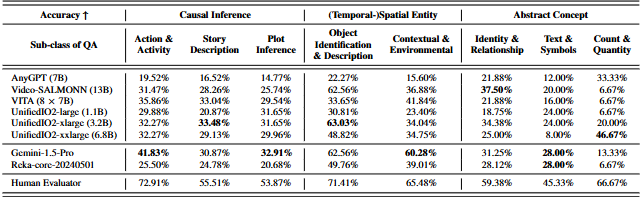 Count&Quantity에서 Gemini-1.5-Pro, Reka-core-20240501, Video-SALMONN같은 건 상당히 낮은 성능을 보이고 UnifiedIO모델은 잘함