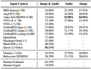 MIO-Instruct, AnyGPT, VideoSALMONN, UnifiedlO2, VITA, OpenOmni, Baichuan-Omni-1.5, Qwen-2.5-Omni