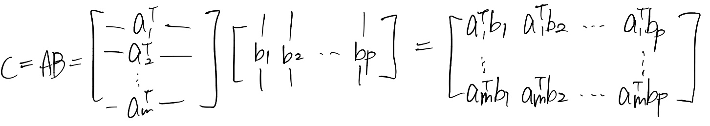 #column vector x=np.expand_dims(np.array([1,2,3]),axis=1) x ''' >>array([[1], [2], [3]]) ''' ones=np.ones([1,4]) #ones()원소가 모두 1인 행렬반환 ones #>>array([[1., 1., 1., 1.]]) A=np.matmul(x,ones) A ''' >>array([[1., 1., 1., 1.], [2., 2., 2., 2.], [3., 3., 3., 3.]]) '''2. 행렬*벡터(Matrix-Vector Products)