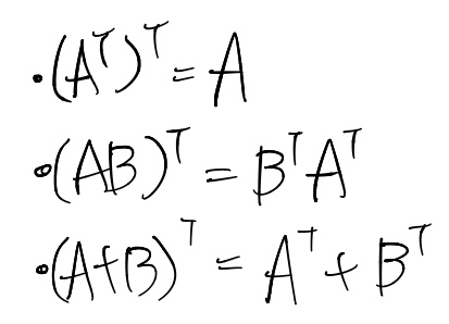 #대각행렬 #diag()를 사용해서 대각행렬 생성가능 np.diag([4,5,6]) ''' >> array([[4, 0, 0], [0, 5, 0], [0, 0, 6]]) ''' #diag함수에 행렬을 전달하면 주대각선 값들을 얻을 수 있음 D=np.array([ [1,2,3], [4,5,6], [7,8,9] ]) np.diag(D) ''' >>array([1, 5, 9]) '''#단위행렬 #eye()를 사용하면 원하는 크기의 단위행렬 생성가능 np.eye(3) ''' >> array([[1., 0., 0.], [0., 1., 0.], [0., 0., 1.]]) '''2. 전치(Transpose)