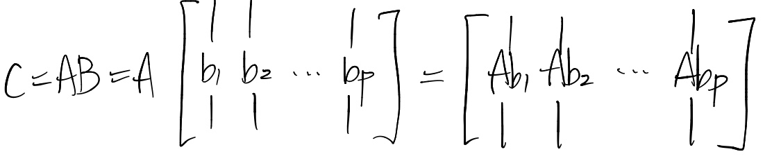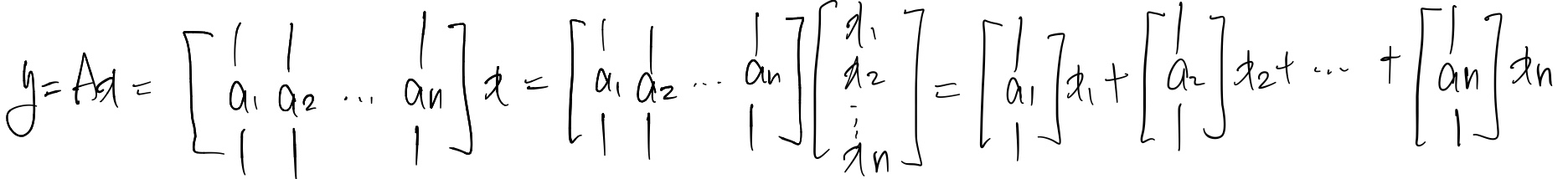 A=np.array([ [1,0,1], [0,1,1] ]) x=np.array([ [1], [2], [3] ]) np.matmul(A,x) ''' >>array([[4], [5]]) ''' for i in range(A.shape[1]): print('a_'+str(i)+':',A[:,i],'x_'+str(i)+':',x[i], 'a_'+str(i)+'*x_'+str(i)+':',A[:,i]*x[i]) ''' >>a_0: [1 0] x_0: [1] a_0*x_0: [1 0] a_1: [0 1] x_1: [2] a_1*x_1: [0 2] a_2: [1 1] x_2: [3] a_2*x_2: [3 3] '''행벡터를 왼쪽에 곱하고 A가 열의 형태로 표현