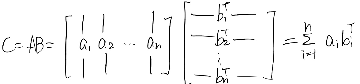 A=np.array([ [1,2,3], [4,5,6] ]) A ''' >>array([[1, 2, 3], [4, 5, 6]]) ''' ones=np.ones([3,1]) ones ''' >>array([[1.], [1.], [1.]]) ''' np.matmul(A, ones) ''' >>array([[ 6.], [15.]]) '''열벡터를 오른쪽에 곱하고 A가 열의 형태로 표현