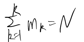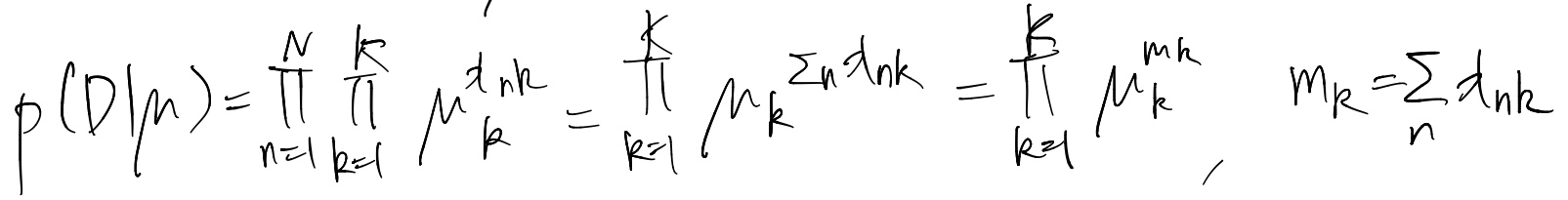 다항분포(Multinomial distribution) : 파라미터 뮤와 전체 관찰개수 N이 주어졌을 때 m1, ..., mk의 분포
