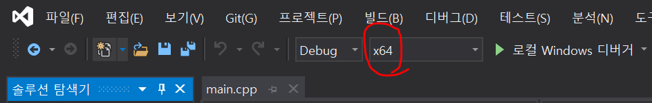 5. 프로젝트 속성에서 건드리는 건 다 끝났고 visual studio창으로 돌아와서 솔루션 플랫폼을 x64로 맞춰준다
