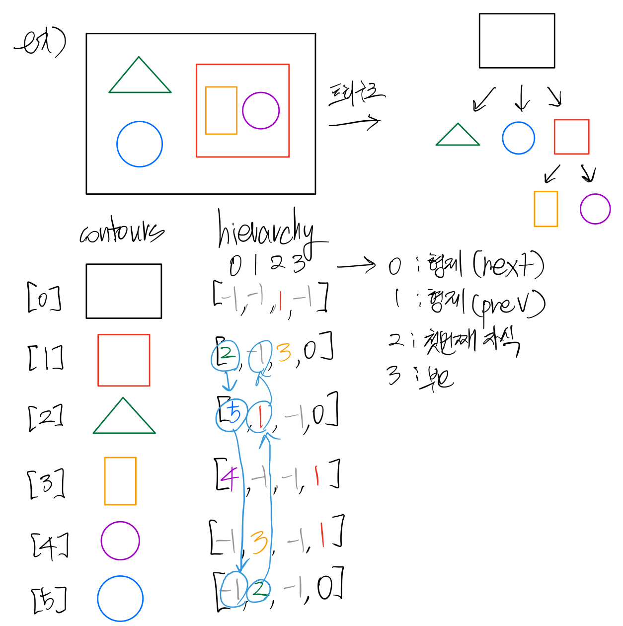 void qrcode_detector() { Mat src = imread("images/qrcode.jpg"); Mat gray; cvtColor(src, gray, COLOR_BGR2GRAY); Mat bin; //이미지 이진화 threshold(gray, bin, 128, 255, THRESH_BINARY); //Canny(gray, bin, 50, 200); 혹시나 너무 어둡거나 그늘진데서 썼을때 캐니를 쓰면 됨 imshow("bin", bin); waitKey(0); //vector<vector<Point>> : 리스트의 리스트의 포인터 //하나의 외곽선 : 포인터들의 집합->리스트의 포인터 //외곽선은 여러개 존재->리스트의 리스트의 포인터 vector<vector<Point>> contours; vector<Vec4i> hierarchy; //칸투어들의 구조화된 정보 //외곽선 검출 //외곽선은 닫힌 구조로 외곽선 안에 외곽선 안에 외곽선,,,->트리 구조로 나타낼 수 있음 : hierarchy //트리구조할지말지 : RETR_TREE //CHAIN_APPROX_NONE : 외곽선을 추출할 때 최적화할수있는 알고리즘 findContours(bin, contours, hierarchy, RETR_TREE, CHAIN_APPORX_NONE, Point(0, 0)); //모든 칸투어 그리기 Mat dst = Mat::zeros(gray.size(), CV_8UC3); //칸투어를 그릴 빈 캔버스 for (int i = 0; i < contours.size(); i++) { //칸투어를 단순화시키는 함수 vector<Point>app; //arcLength():외곽선길이출력 //외곽선의 2%를 thresold로 준다->외곽선의 점을 찍는 걸 50개 밑으로 //2~50개 안으로 int thres = max((int)(arcLength(contours[i], true) * 0.02), 2); approxPolyDP(contours[i], app, thres, true); //Ramer-Douglass-Peucker알고리즘 contours[i] = app; Scalar c(rand() % 160, rand90 % 160, rand() % 160); //랜덤한 rgb값(그릴 칸투어의 색깔) drawContours(dst, contours, i, c, 2); //i번째 칸투어를 찾아서 그려줌 } imshow("dst", dst); waitKey(0); //사각형만 그리기 for (int i = 0; i < contours.size(); i++) { auto& con = contours[i]; if (con.size() == 4) { drawContours(dst, contours, i, Scalar(255, 255, 255), 2); } } imshow("dst", dst); waitKey(0); //부모와 자신, 자녀 모두 사각형인 도형만 그리기 for (int i = 0; i < contours.size(); i++) { //auto&==vector<Point>& auto& con = contours[i]; Vec4i& hie = hierarchy[i]; int a = hie[3]; //부모가 없거나 자식이 없으면 continue if (hie[3] == -1 || hie[2] == -1) continue; auto& parent = contours[hie[3]]; auto& child = contours[hie[2]]; //qr코드 사각형의 비율내면 if (parent.size() == 4 && child.size() == 4 && con.size() == 4) { /*double parentLen = arcLength(parent, true); double conLen = arcLength(con, true); double childLne = arcLength(child, true); printf("%lf %lf \n", parentLen/conLen, conLen/childLen);*/ drawContours(dst, contours, i, Scalar(0, 255, 255), 2); } } }