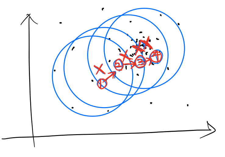 2. 시작점을 기준으로 주위에 일정 threshold범위내에서 점의 중심을 찾음