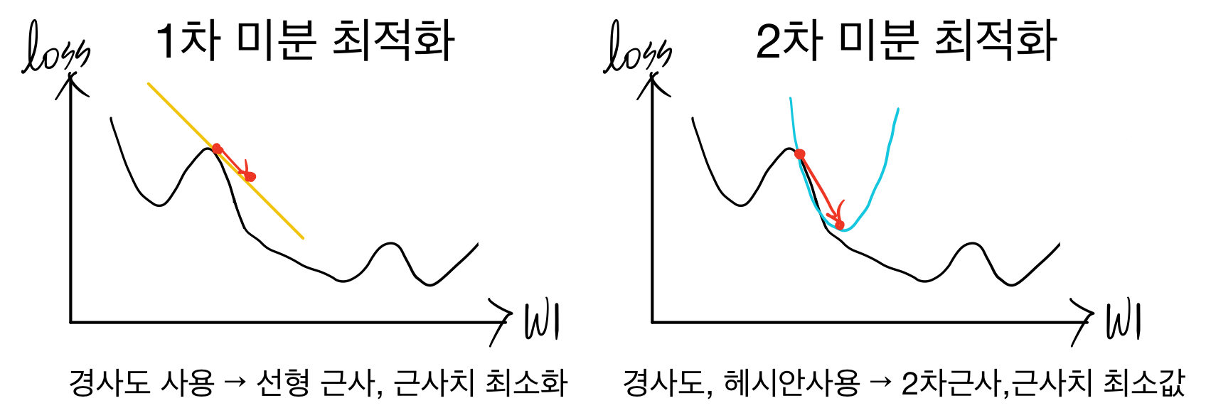 이전까지는 w의 최적화를 하는 방법을 1차 미분(gradient)를 이용해서 진행=경사 하강법