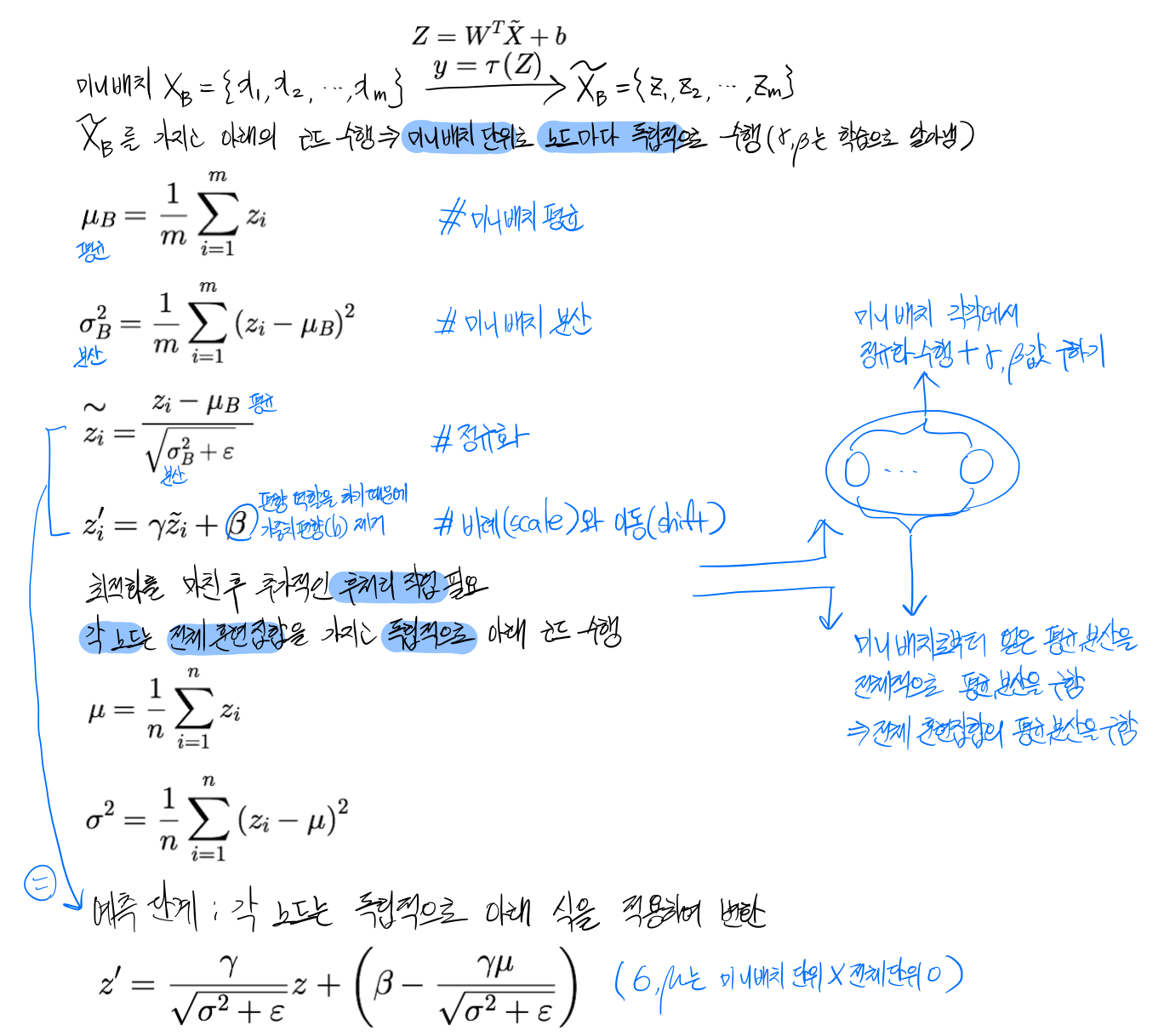 - 내부의 공변량 변화(internal covariate shift)->데이터의 분포가 수시로 바뀌는 셈이라 학습을 방해하는 요인이 됨