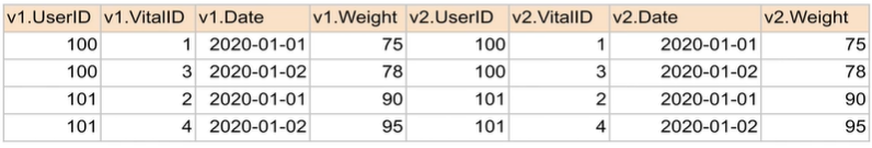 SELECT * FROM raw_data.Vital v1 JOIN raw_data.Vital v2 ON v1.vitalID=v2.vitalID;