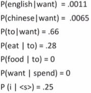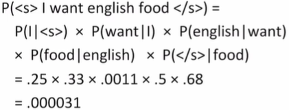 P("its water is so transparent")=P(its)*P(water|its)*P(is|its water)*P(so|its water is)*P(transparent|its water is so)