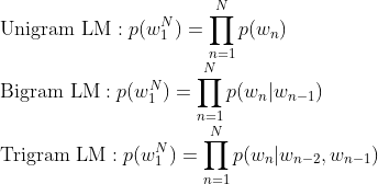 일반적인 경우 ->W1~Wn까지의 sequence가 주어져있을때 각각의 Wi와 이전의 모든 조건부확률을 곱해서 구함