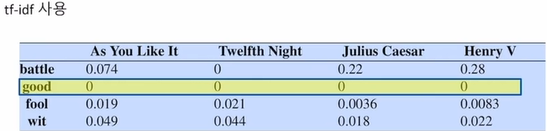 빈도수 기반에서 good이 큰 값을 가지는 것을 볼 수 있는데 good은 굉장히 많은 문서들에 등장해서 변별력없는 단어