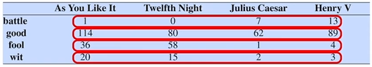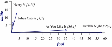 문서(작품)들에 나타난 단어들의 빈도수 벡터를 시각화, 관련성이 있는 문서가 비슷한 방향으로 향하는 것을 볼 수 있음 단어 벡터