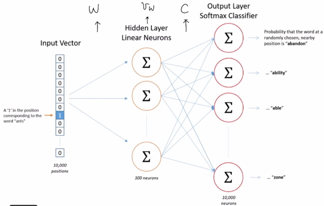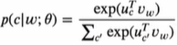 단어 w가 주어졌을 때 단어 c가 주변에 나타날 확률은?