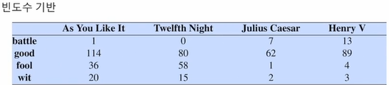 각 문서는 단어들의 벡터로 표현됨, 문서벡터(Term-document행렬)