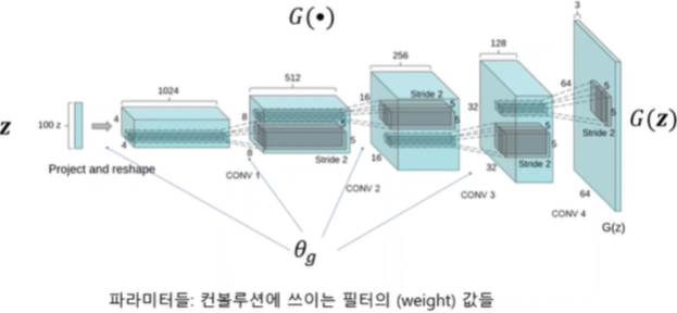 z(input, 100 noise)를 입력으로 받는 convolution network
